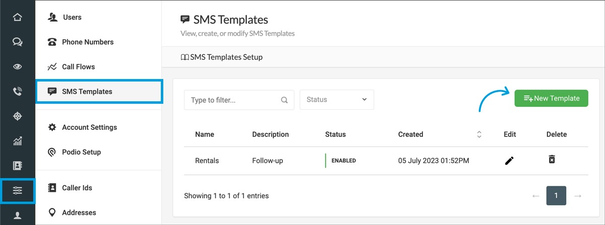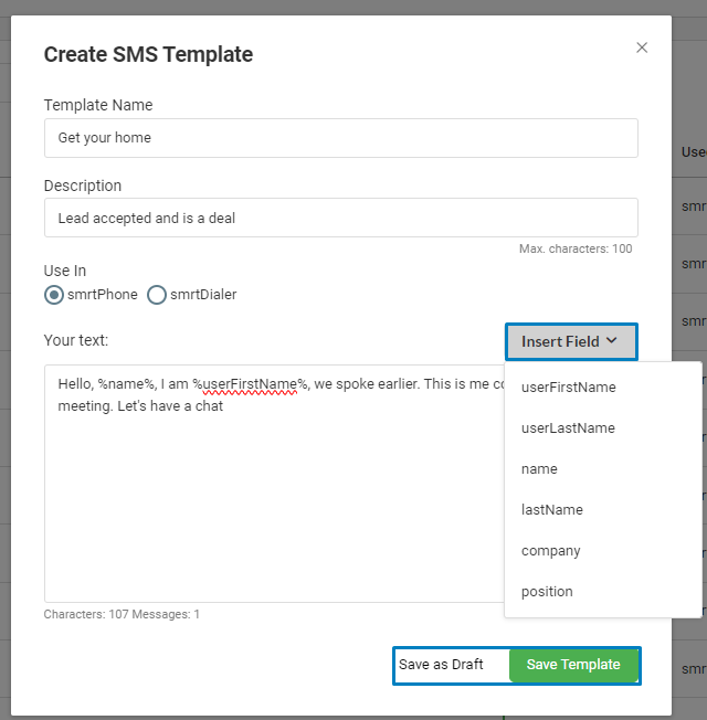 You can create and use SMS templates for smrtPhone or smrtDialer. Pick the product you need to create an SMS template for. Once you create an SMS Template for smrtPhone, you cannot move it to smrtDialer or vice versa. You can only edit the details or delete them but not switch the product.