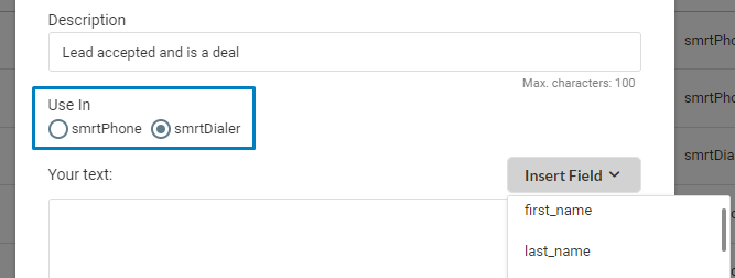 Fields differ from smrtPhone to smrtDialer. For smrtPhone you have fields like First Name, Last name, or Company, while for smrtDialer you find fields like Phone Number, Postal Code, or Property Type.
