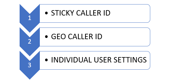 A Paired Caller ID set for a particular Contact takes precedence over this hierarchy. If a contact has a paired caller ID set, the system will use that number, regardless of the Sticky, Geo Caller, or any individual user caller ID setup.